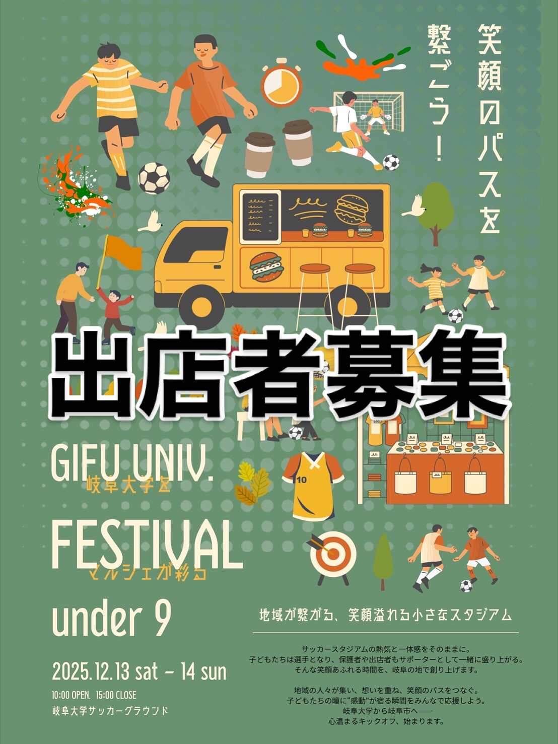 【GIFU.UNIV FESTIVAL UNDER.9出店者... 【GIFU.UNIVFESTIVALUNDER.9出店者募集のお知らせ】主催:岐阜大学サッカー部日にち:2025年12月13日(土)・14日(日)(両日・どちらかでも可)時間:10:00~14:00場所:岐阜大学サッカーグラウンド出店…